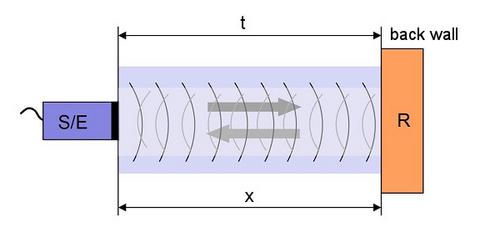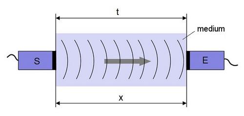 In the simplest case, it is described by the path–time law, which is explained schematically in Fig. 1. Here, sound waves are transmitted through a medium by means of a transmitter or sound generator (ultrasonic sensors or also referred to as a probe) that emits the sound pulse. At the end of the transmission path is the receiver (ultrasonic sensors), which should be of the same design as the transmitter (see: ultrasonic transmission technique). The electrical pulses sent to the transmitter S are converted into mechanical pulses, transmitted by the medium as waves and received by the receiver E (transmission technique). The time t required by the sound to travel the path x can be determined from the representation of the vibrations registered at the receiver according to Eq. (1).