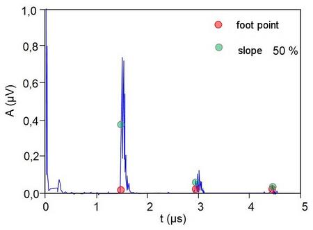 There are three different approaches to measuring the sound transit time. The first approach uses the signal maxima, as shown in Fig. 3. In most cases, however, the signals are not as ideal as shown in Fig. 3. Therefore, two other evaluation methods are used. A second approach uses the base point of the signal (Fig. 4). This circumvents the difficulty that significant deviations arise when measuring the maxima in cast materials or plastics, because sound dispersion, especially in plastics, causes different frequencies to be transmitted at different velocities, which results in a broadening of the signal.