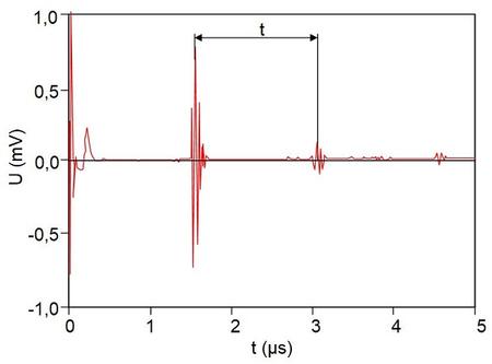 Fig. 3: Voltage pulses for measuring the transit time on a plane-parallel PMMA plate using pulse-echo technique with ultrasound