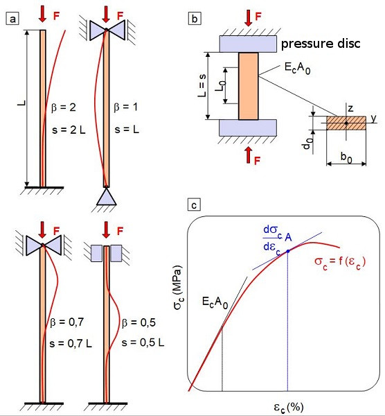 In Eq. (7), Ec is the modulus of elasticity under compressive stress, Iy is the minimum axial moment of area of the section, and s is the so-called buckling length, which is the product of the buckling length coefficient β and the test specimen length L (s = β L). The value λ is referred to as the slenderness ratio and is calculated according to Eq. (9), where Iy is the so-called smallest radius of inertia according to Eq. (10).