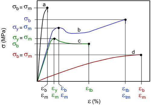 The associated characteristic value on the horizontal axis marks the location where the first maximum occurs and is referred to as the strain of the tensile strength or, better, the yield strain εm. This characteristic value can also correspond to the tensile strain at yield εy or the tensile strain at break εb. In principle, the strain up to the yield strength εy (diagrams b and c in Fig. 1) must be measured with strain gauges as a normative value or, in the case of diagrams without yield strength up to break (diagrams a and d in Fig. 1), also determined using clip-on extensometers (see: tensile test, path measurement technique).