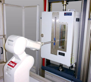 The degree to which mechanical testing methods are integrated into the manufacturing process is determined on the one hand by the performance of the components integrated into the testing system and the quality of the testing software, and on the other hand by the time-dependent availability of the standardised test specimens that are usually required. For fully automatic testing, the testing machine is supplemented by a computer-controlled handling system that removes the test specimens from a magazine and places them in the holder of the testing machine (Fig. 5).