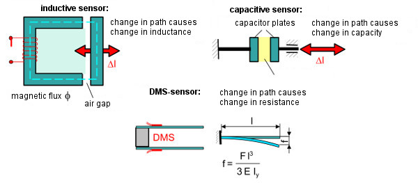 Inductive measuring sensors are mostly used for larger elongations and utilise the change in inductance of the moving air gap, which causes a change in current. Differential transducers with two inductors can significantly increase the resolution.