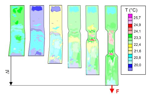In addition to a change in internal energy, every deformation of a material is also associated with heat toning. If the test is carried out in a ‘temperature-sensitive’ range, even slight thermal effects or temperature changes can have an influence on the deformation behaviour. This reaction of the heat toning on the deformation behaviour is the reason for the so-called ‘cold stretching’ with flow zone formation.