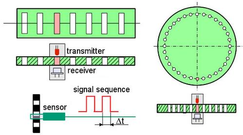 Regardless of the age of the testing machines, measuring rods are almost always installed. On older machines, these are used to display the absolute displacement with a resolution of ± 1 mm on the material testing machine, while on newer systems they are used to determine the emergency stop and traverse position. With analogue measurement techniques, a time- and displacement-proportional voltage signal is available at all times, whereas with incremental techniques, discrete counting pulses are applied, which are added up in a memory to give the elongation value. Newer absolute position measuring systems for measuring the traverse path are mostly based on incremental (counting) technology and can achieve resolutions of up to 0.1 µm. The traverse path or extension is measured by sensors that move with the traverse or by converting the vertical movement to a perforated circular disc (Fig. 10), which then allows the nominal strain εt to be calculated in relation to the clamping length. The translation of the measuring scale or the rotation of the circular disc produces a digital signal sequence with a resolution of ± 1 digit. The hole spacing is then used to obtain the path resolution in µm.