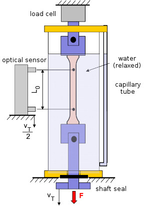 The test specimen is placed in a glass box and fixed with clamps. The box can be opened to change the test specimen. On the top, the linkage is connected to the load cell, and on the bottom, the test specimen is loaded via the movable traverse. The elongation or strain is measured with an optical sensor via measuring marks on the surface of the test specimen. A fine capillary tube is attached to the side of the container as a connected vessel, which is used to record changes in volume during the tensile test. These changes in volume are caused by the formation of cavitations, microcracks, or an increase in density as a result of increasing orientations.