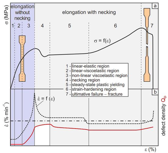 Figure 3 shows that there is no change in defect density in the linear-elastic and linear-viscoelastic deformation range due to the constant volume. In the non-linear viscoelastic range (see: elasticity), irreversible deformations occur, resulting in microcavitations and an increase in defect density until the yield stress is reached. In the necking range and in the range of steady-state flow, QD decreases again due to the increase in molecular orientation. This process continues with a further increase in the orientation state, even in the hardening range, and ends with an increase in defect density at ultimate fracture.