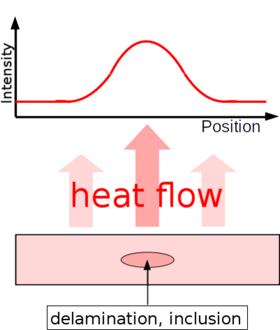 The heated test specimen emits infrared waves into the environment, causing it to cool down. Due to the different heat conduction properties of delaminations and inclusions, higher intensities of infrared radiation occur at these points.