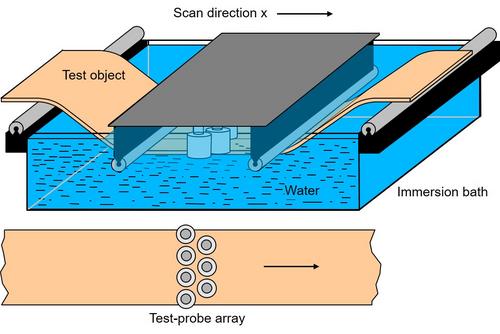 If the set-up is a passive one, then the testing object (plates or tubes) passes a stationary immersion bath continuously, which can also serve as cooling bath, and fixed probes or an array detect flaws online in the production process (Figure 1).