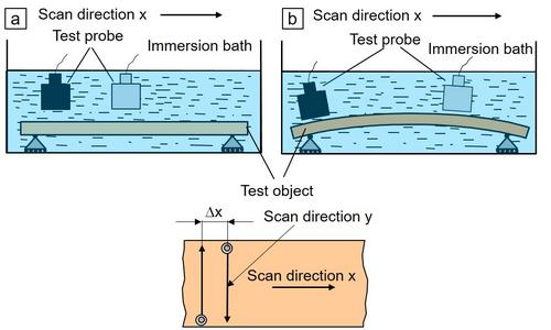 The “active” set-up also uses an immersion bath, which have to be matched to the test object geometry too. However, this is fixed in the bath and the ultrasonic probe will be moved by the scanner (Figure 2). Scanning the testing object at defined positions on the y-axis, the A(t)-signals will be registered and after the scan the scanner is moved by a certain distance and the scan parallel to the y-axis begins and so on (Figure 2a). At curved objects, the contour of the surface have to be determined before the scan begins. For a vertical intromission of sound, the probe is to rotate in such a way that its acoustical axis is always perpendicular to the surface of the testing object (Figure 2b).