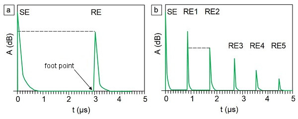 Fig. 2: Ultrasonic wall thickness measurement using the pulse-echo ultrasonic technique on GFRP (d = 34.4 mm) in direct coupling as (a) without delay and (b) with delay [5]
