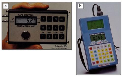Fig. 3: Digital ultrasonic wall thickness gauges (a) from Karl Deutsch Prüf- und Messgeräte Bau GmbH und Co KG, Wuppertal and (b) from Olympus IMS