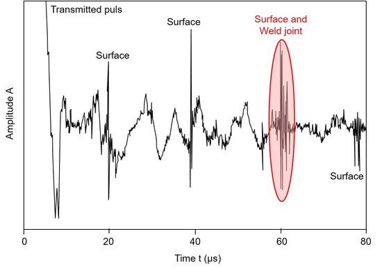 In the Figure 3 the welded influence zone (WIZ) is shown (reddening), which makes difficult the evaluation of the measurement's result by changed material properties. Because of the high sound absorption and the inclined incidence of sound, the signal (Fig. 4) is very noisy. By means of a sound beam analysis, the individual echoes can be assigned to the defined incidents.