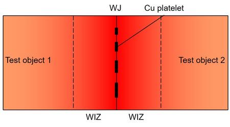 | Bild 3: | Schema of a specimen on poly(methylmethacrylate) (abbr.: PMMA) with weld joint where copper stripes are embedded as flaws (top view) |