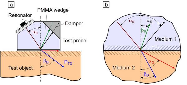 This process for the critical angle of the total reflectance is shown in Fig. 1a. There the refracted longitudinal wave have the critical angle of the total reflectance (red arrow) and only the transversal wave (blue arrow) propagates in the object volume, wherewith only the transversal wave exists in the material, which simplified the interpretation of the received signal. The general case for an incident angle, which deviated from the critical angle, is shown in Fig. 1b.