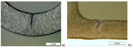 | Fig. 2: | a) Polarisation microscope image of a thin section, component made of PA6 in the area of the weld line [2], b) reflected light microscope image of a component made of polyoxymethylene (abbreviation: POM) with circular weld lines [3] |