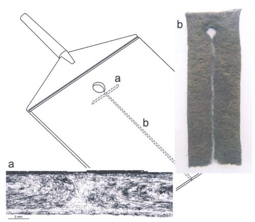| Fig. 3: | Weld line morphology of long-fibre-reinforced polypropylene (steel fibres), a) light microscope image of a thin section, b) steel fibre network in the weld line area after ashing [4] |